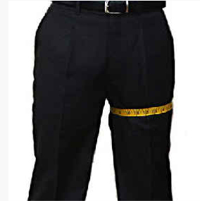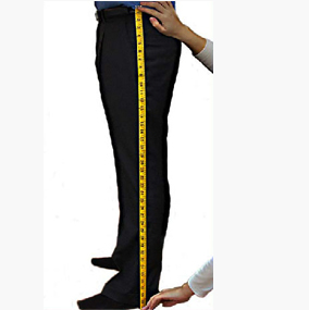 Measure from the top of your pant’s waistband to the floor along the outside of your leg. Make sure the tape is tight, that you are standing straight, and then measure.